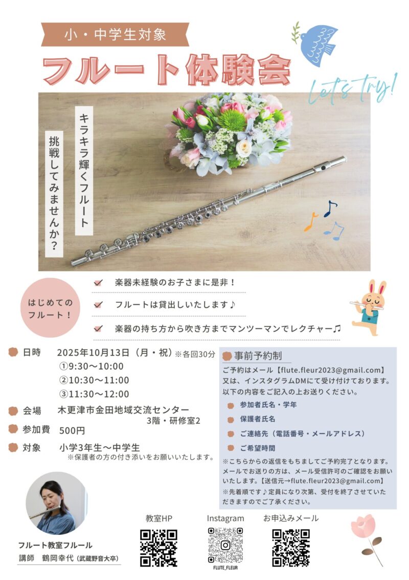 初めて教室を飛び出して、10/13(月・祝)に小・中学生向けのフルート体験会を行います✨
