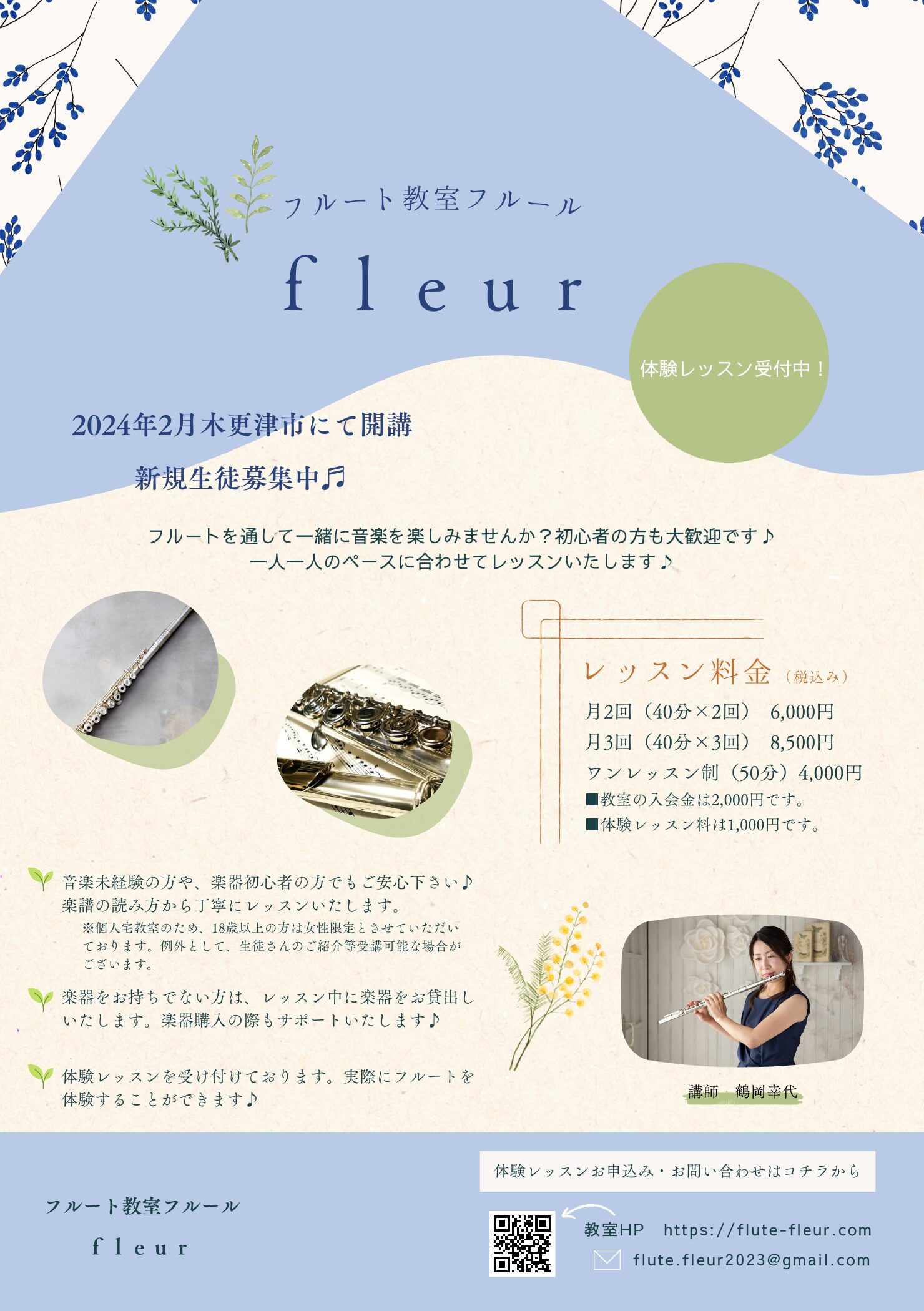教室のチラシ♫ 教室情報 2024.05.282025.05.26 チラシができました! Instagramの方には載せていますが、チラシを作成したのでこちらでもどーんと大きめに載せたいと思います✨完全手作りですがどうでしょうか・・♫試行錯誤しながら作りました!多くの方に見てもらえたらと思っています・・♪ ただいま体験レッスンを受けつけております!実際にフルートを体験できますので、是非お気軽にお問合せください☆ 体験レッスン申込み・お問い合わせはコチラ